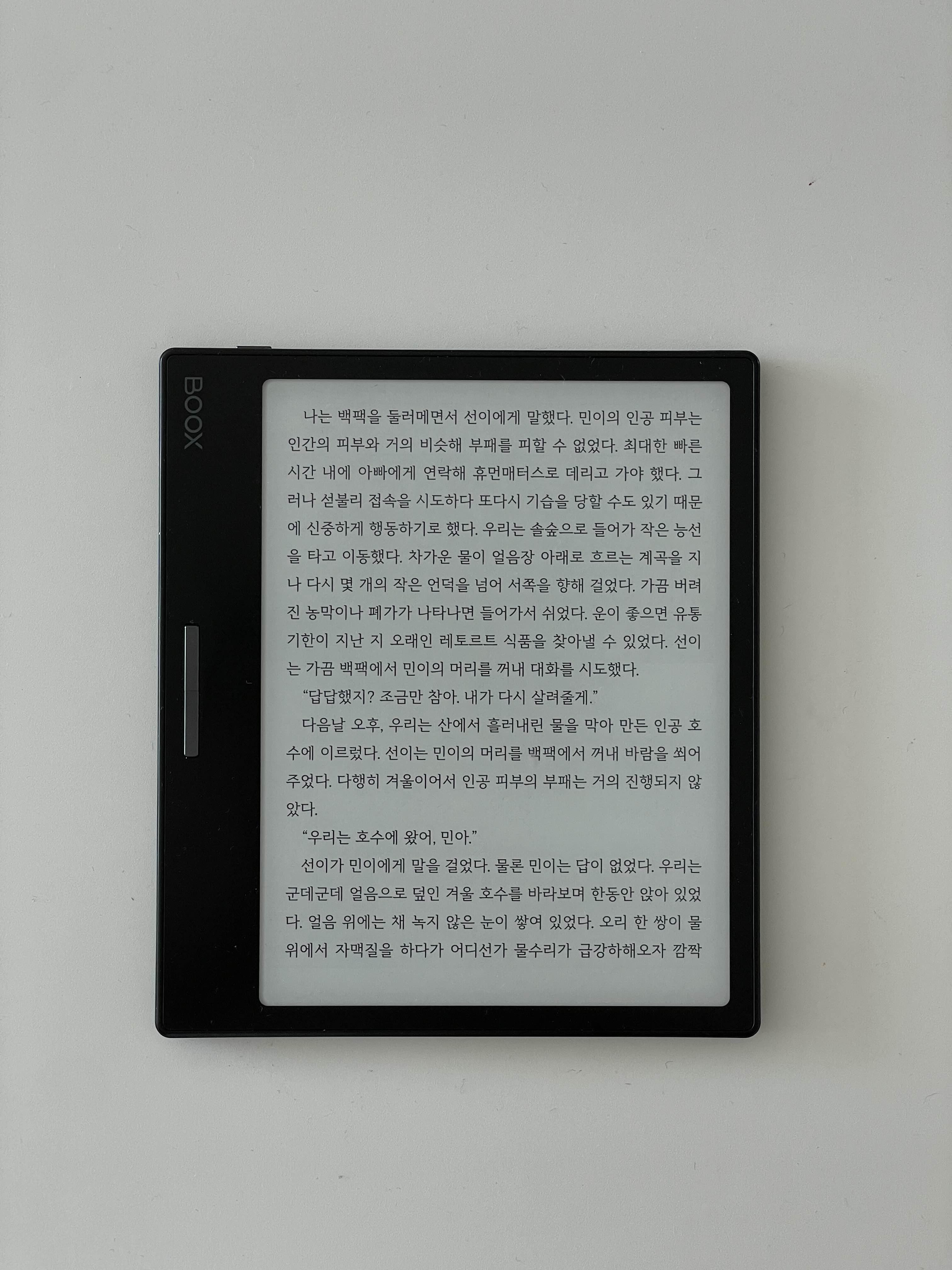 이북리더기에 필요한 적절한 것들을 거의다 가진 욕심쟁이라고 할까? 다른 기기들과 비교했을때 꽤나 할 수 있는 것들이 많다. 내가 이북리더기를 선택할때의 기준으로 빠져선 안되는 것들이 몇가지 있다. 우선 300ppi 해상도. 300이 안되는 제품들도 있다. 같이 놓고 비교해 보면 차이가 느껴진다. 다음은 색온도 조절. 밝기 조절은 되지만 색온도가 조절이 안되는 제품이 있다. 이거 꽤나 중요하다. 밤/낮, 실외/실내 장소와 상황에 따라 빛이 달라지는데 그때마다 살짝씩 조절해 주면 눈이 더 편하다. ‘물리키’ 이건 써봐야 알 수 있다. 물리키가 있는 리더기와 없는 리더기의 사용감 차이를 아주 크게 느끼게 해준다. 그밖에 micro SD 슬롯도 있다. 자신이 소장하고 있는 책들 자료들을 더욱 많이 넣을 수 있다는거다. 충전을 편하게 해주는 USB C타입은 덤이다. 심지어는 스피커도 있고 블루투스 이어폰과 연결도 된다. 참. 별게 다 된다.