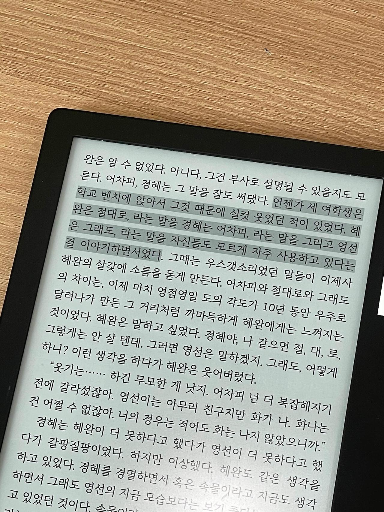언젠가 세 여학생은 학교벤치에 앉아서 그것 때문에 실컷 웃었던 적이 있었다. 혜완은 절대로, 라는 말을 경혜는 어차피, 라는 말을 그리고 영선은 그래도, 라는 말을 자신들도 모르게 자주 사용하고 있다는 걸 이야기 하면서 였다.