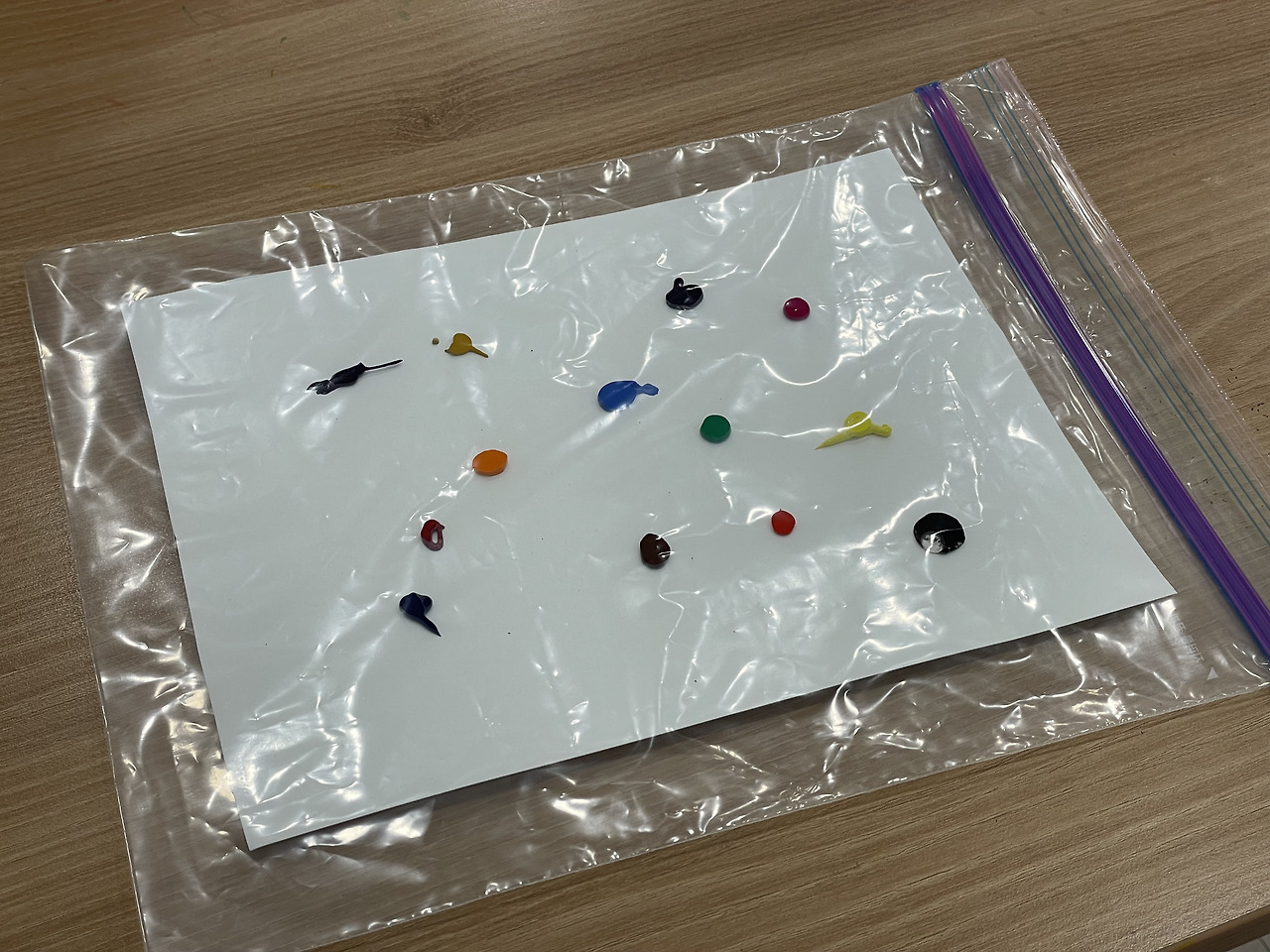 - 물감을 짠 도화지를 지퍼백 안에 조심스럽게 넣고 밀봉한다.