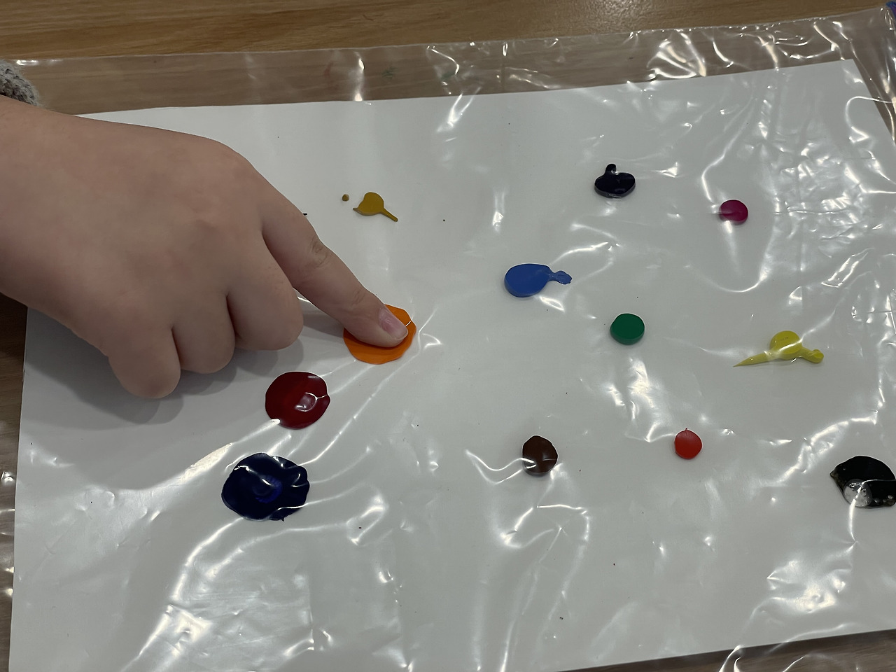 - 손가락으로 물감을 누르고 퍼뜨리는 과정에서 촉각 자극을 경험해요.