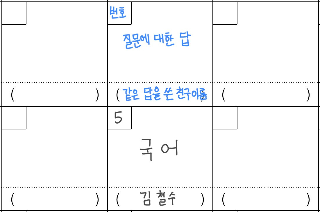- 하단에 있는 ( 괄호 ) 안에는 나와 같은 답을 쓴 친구의 이름을 씁니다.