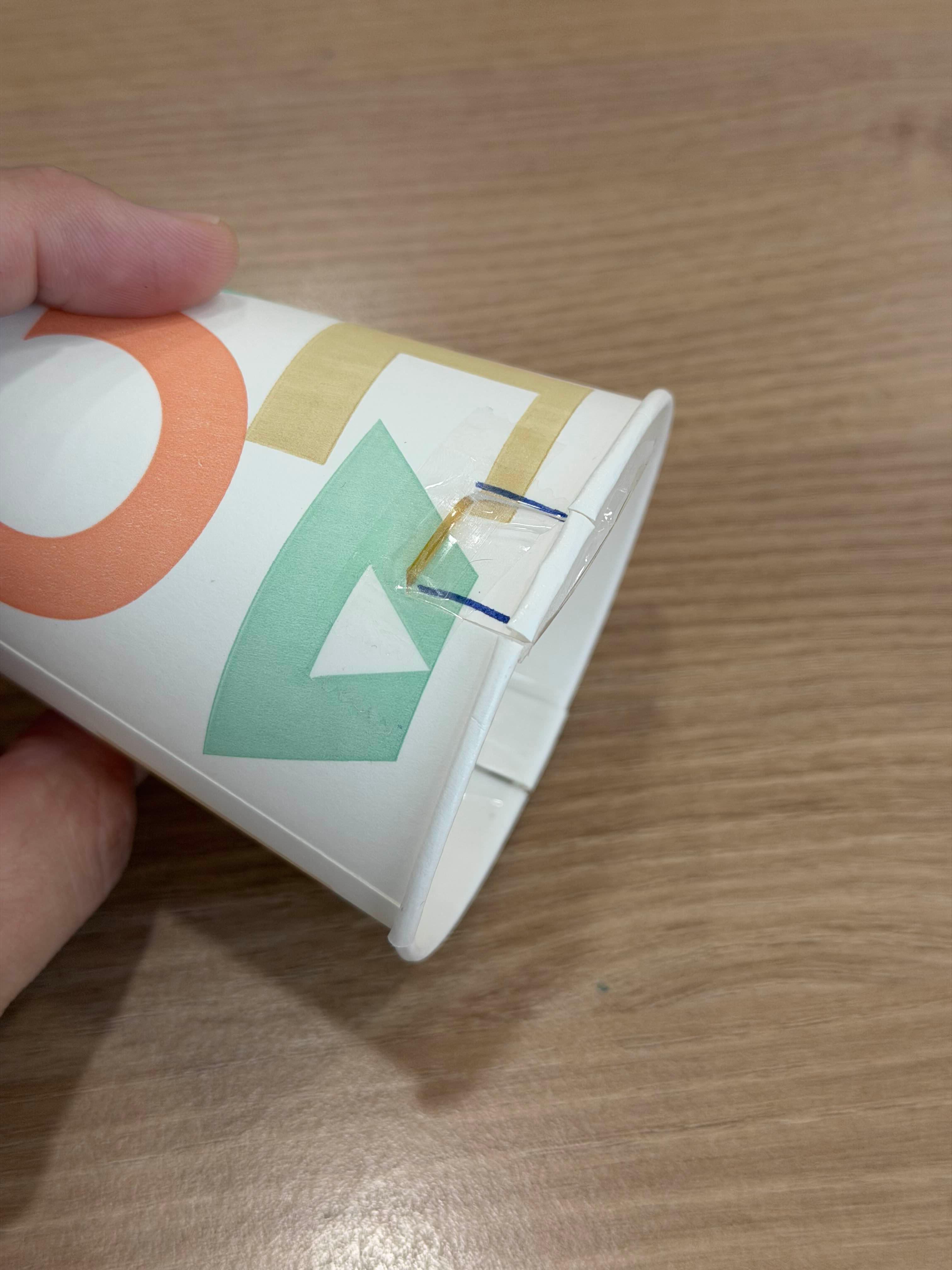 • 그 구멍에 고무줄을 끼우고 컵 안쪽에서 테이프로 고정합니다.