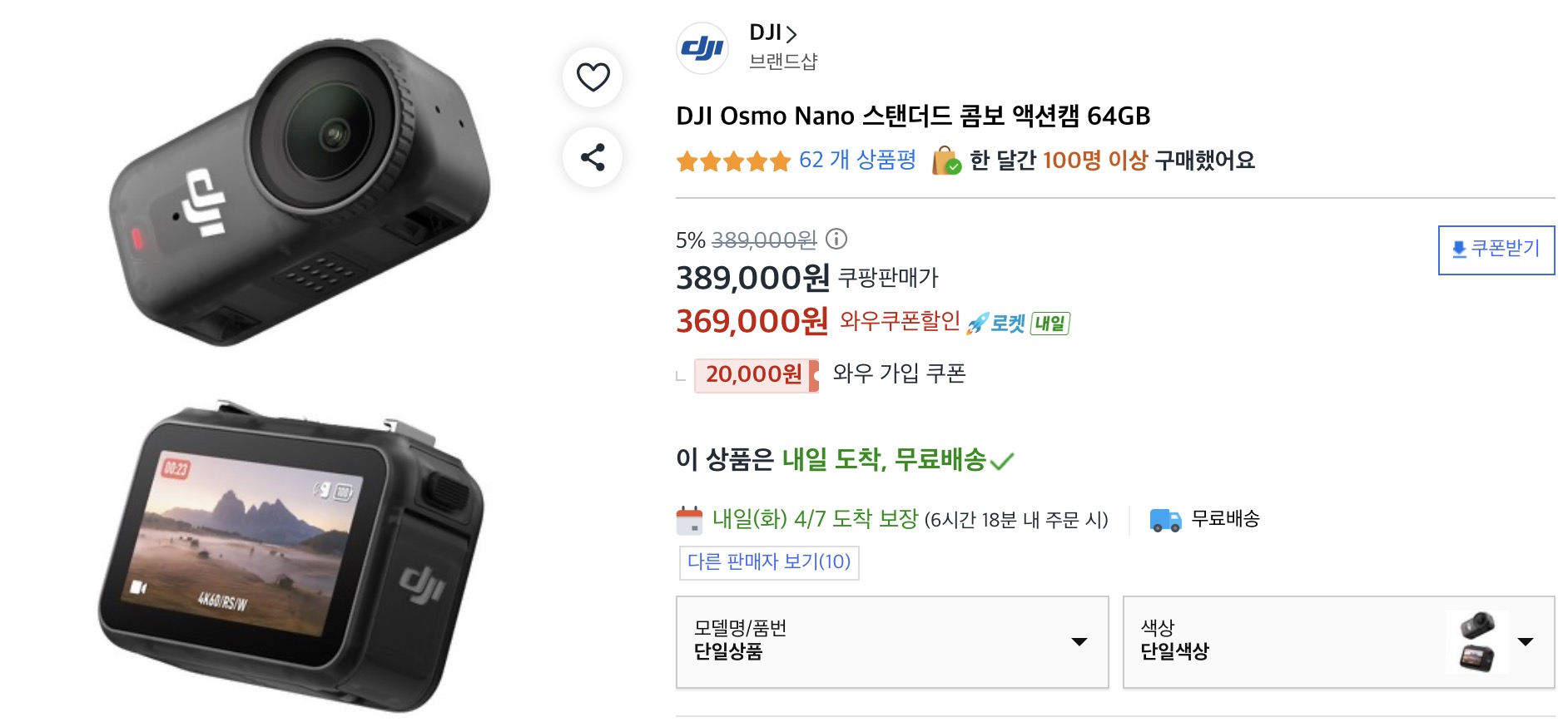 쿠팡에서 DJI Osmo Nano 스탠더드 콤보 액션캠 64GB 구매하고 더 많은 혜택을 받으세요! 지금 할인중인 다른 액션캠 제품도 바로 쿠팡에서 확인할 수 있습니다.