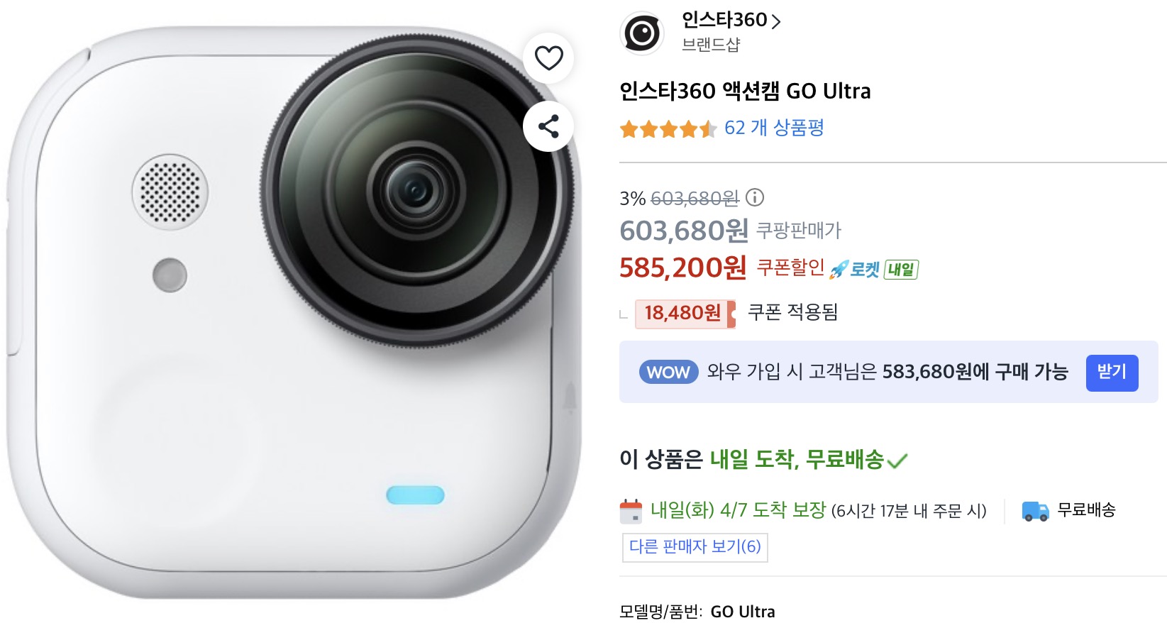 쿠팡에서 인스타360 GO Ultra 크리에이터 액션캠 번들 구매하고 더 많은 혜택을 받으세요! 지금 할인중인 다른 액션캠 제품도 바로 쿠팡에서 확인할 수 있습니다.